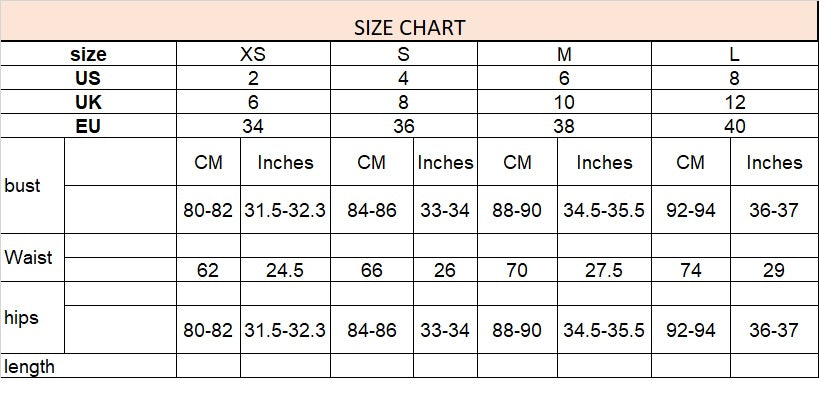 Sizes: XS, S, M, L (Size chart included in product images)